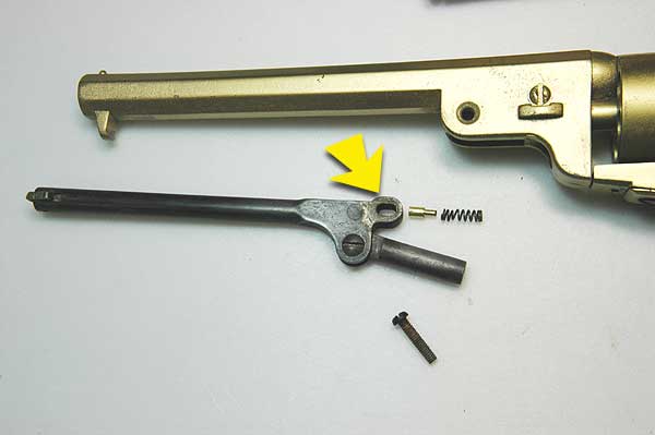 昔の実銃ではよくあるパターン。組み込む際、ハンドの裏にスプリングを入れるのが面倒である。