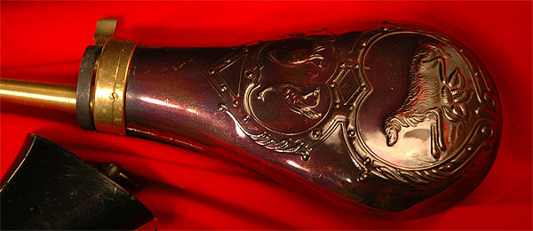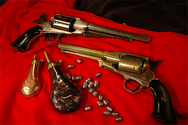 写真小道具のフラスコは、黒色火薬入れでレバーを開けると火薬をシリンダーに入れることが出来る。 犬の模様はレミントン用である。写真の物はイタリア製レプリカ。私のページの「海外買物」に記述してある。 20ドルくらいと送料でアメリカから購入できる。