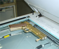 そこで完全オリジナルで正確なイラストを描く方法を考えついた。 最近のコピー機はスキャン機能が付いている。 そこでモデルガンを置いて始めるのだが、ここで注意する事は水平になっているかを 確認する事である。 特に左右が対称でないルガーやランヤードの出ているP-38 などは特に注意。 また、ガバメントのように単純な形は横向きにおいても良いが P-08 のように入り組んだものは縦置きにしないと正確にトレースできない。 |