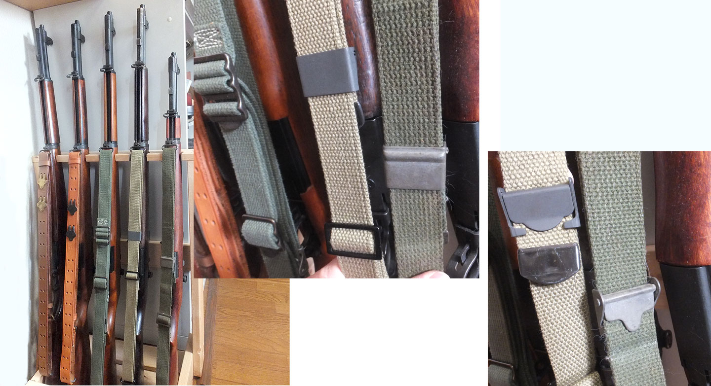 写真左のガランド・スリングは、時代順に1907スリング初期の真鍮金具、同スリング後期のスチール金具、