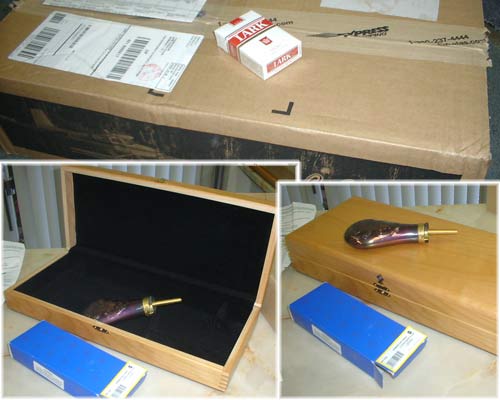 大好きになってしまった。しかもパーカッション式前装銃に興味を持った。 そして自然とフラスコ、モデルガン、ニップルケースと買って行き当然の結末として 木製ケースに手を出した。日本で売っているところが見つからないのでアメリカから購入する事とした。 前回も実績のあるCabela's のこちらのページの51ネービー用を頼んだ。↓ http://www.cabelas.com/cabelas/en/templates/catalog/store-home.jhtml 上記ページの「Hunting/Optics」→「Black Powder」→「Black Pawder Accessories」のページの 下のほうにある「Cabela's Presentation Cases」の中の一番最初に書いてある51ネービー用である。 ついでにレミントンのフラスコも頼んだ。