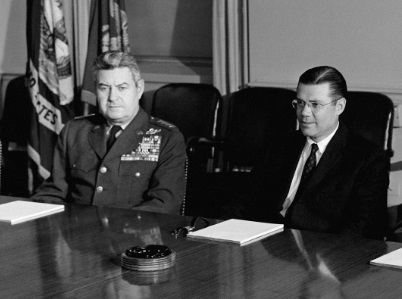 空軍からの絶賛と陸軍からの否定意見が両立する中、M-14 の生産も停滞し、ベトナム戦線は拡張していきます。 効率化、予算削減を目指すマクナマラは、AR-15 の採用とM-14 の生産停止を決断します。 空軍出身の彼には、陸軍の意見よりもかつての上司であるルメイ将軍の意見の方が通りやすかったのは想像に難くありませんが、 物事を効率的に整理しようとする彼の方針には、小口径高速弾を大量に持ち運び、フルオート射撃できるAR-15 は、 正当な評価としてM-14 よりも優れていると判断したのでしょう。