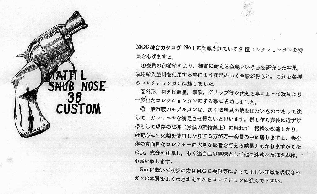 日本MGC 協会のスタートです。 おもちゃと実銃は完全に区別された別の物であるべきだという姿勢は、初期のころからの神保氏の一貫した主張でした。 氏の自伝「MGC をつくった男」を読むとGun 趣味のスタートが米国人のコレクションからのようなので、そのへんから実銃とトイガンは 完全に別物であるべきだとの感覚を得たのではないでしょうか?