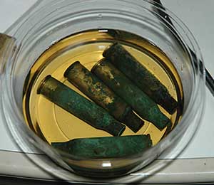 オークションで購入した緑青だらけの38式小銃弾の実物。 猛毒のように見える緑青は無害だという事が判っている。そうだろう、お城の屋根に 銅ぶきの瓦が使われているけれども、お城の周りに草木が生えないなんて聞いたことがない。 さっそく米酢に浸けてみた。浸けたとたんに小さな泡が発生。これは期待できる。 |
