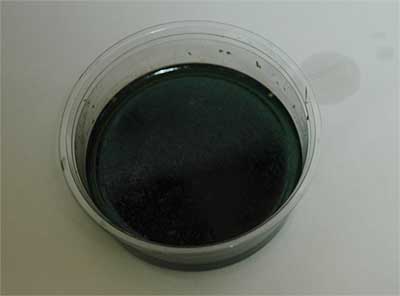 酢漬けで綺麗にしようと漬け込んでいた。右写真の青汁のようなものは、我が家の米酢である。2回、薬莢掃除に使用していたため、 真っ青になっている。この中にクリップを放り込んだ。