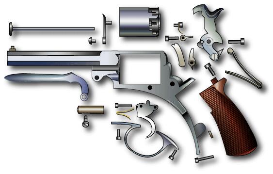 ETHAN ALLEN 氏によるペッパーボックスGun。 米国では、かなり有名らしく商業的にも成功した。様々なタイプあり。 ダブルアクション、シリンダー回転、シリンダー固定といったメカニズムを 含んでいた。カット図は想像でかなりいい加減。概念のみ得て欲しい。 ピンク色のピンは動かない位置。